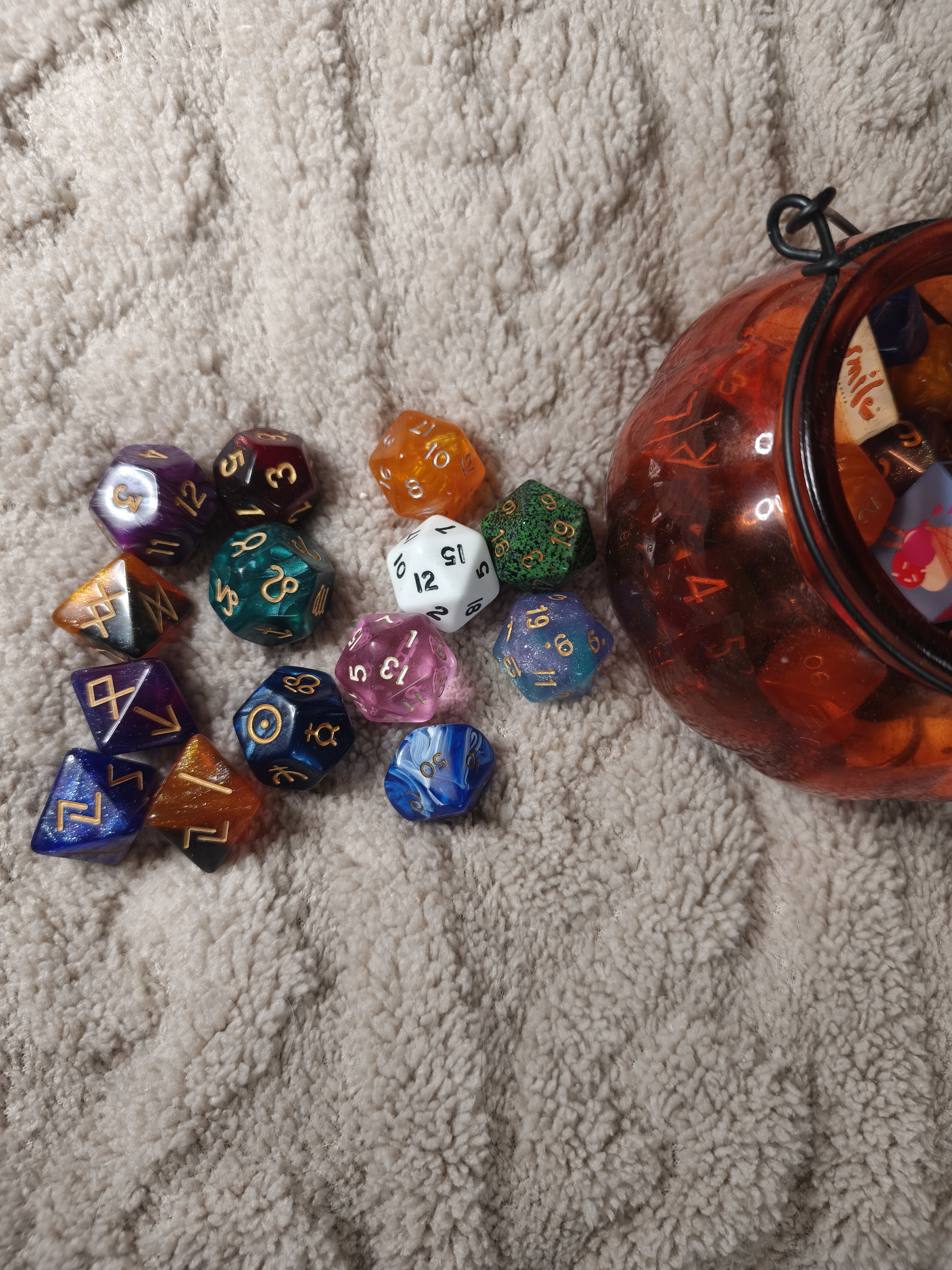 И кучка разрозненных кубов, которые мне кто-то дарил из своих наборов или я покупал в разных магазинах в городах поштучно. Включая розовый д20, похожий на прозрачное желе. Когда кто-то из персонажей артачится, ходовая угроза - ща розовым прокидаю!